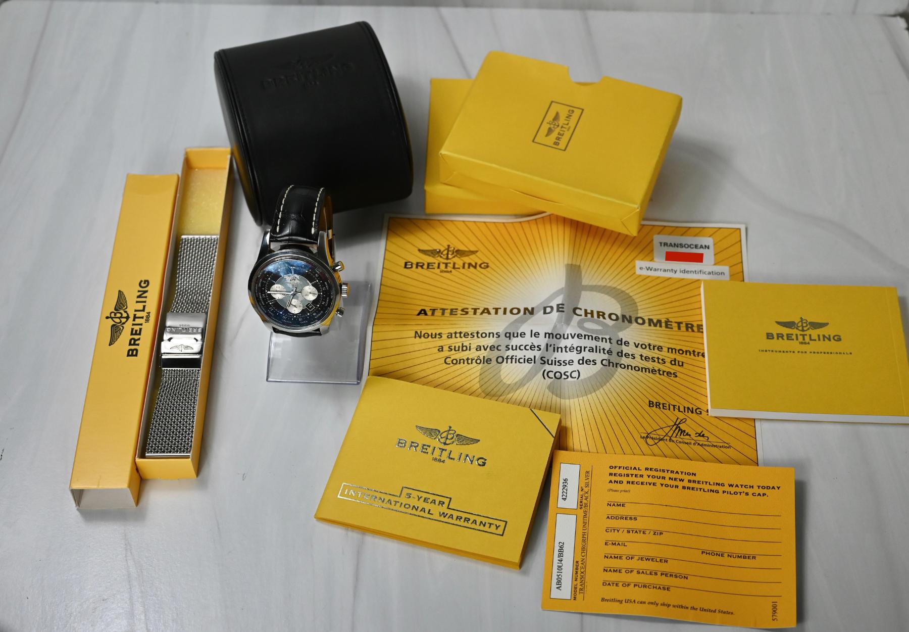 This example is fitted with the Breitling black leather strap and steel folding clasp, completing the refined yet versatile aesthetic. Additionally, it comes with a Breitling steel mesh bracelet. With 100 meters of water resistance, it is robust enough for daily wear while remaining unmistakably elegant.