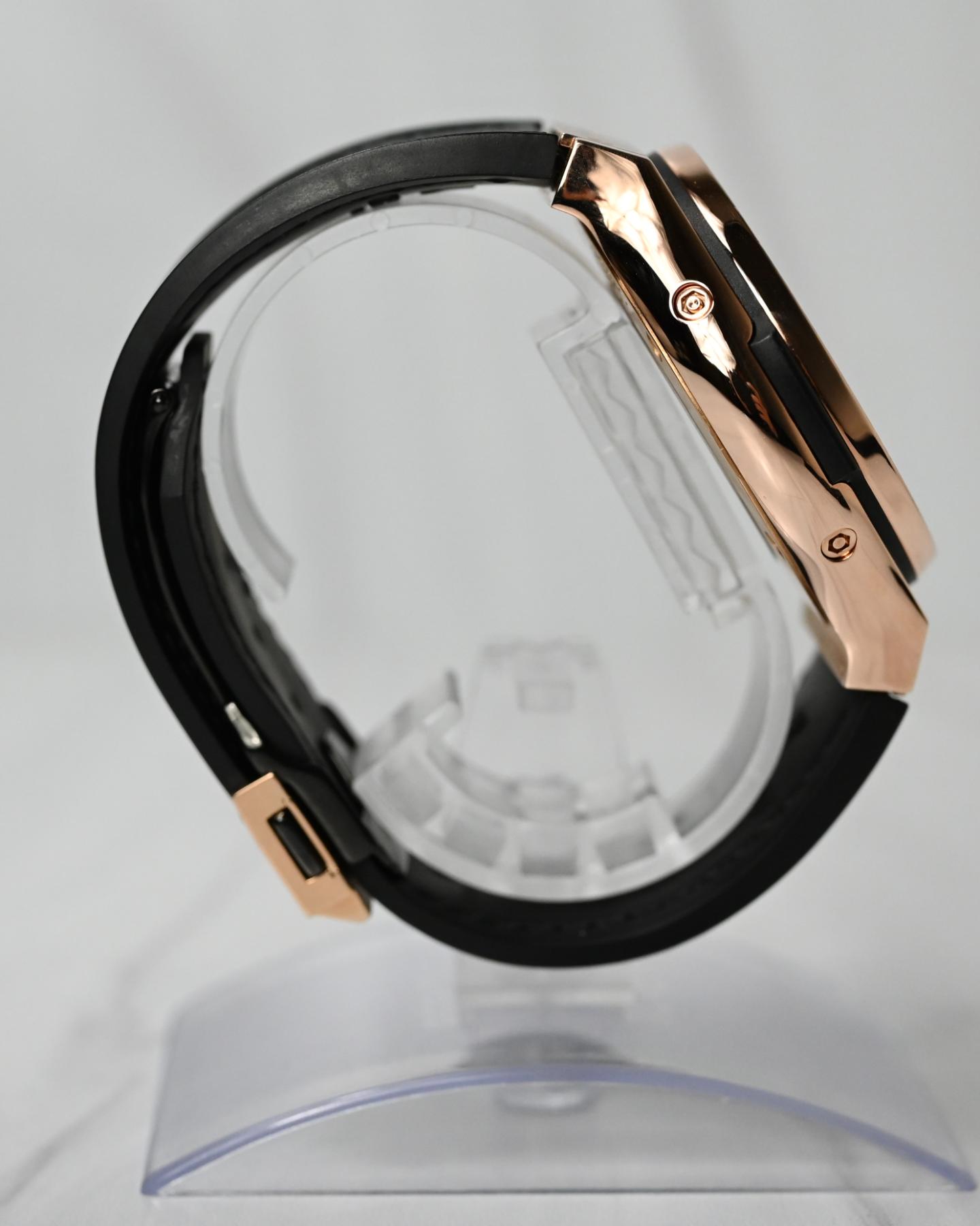 The watch is powered by an automatic moonphase movement, visible through the sapphire crystal caseback, and is paired with a black alligator leather strap with rubber lining for comfort and durability, secured by a matching King Gold deployant clasp.